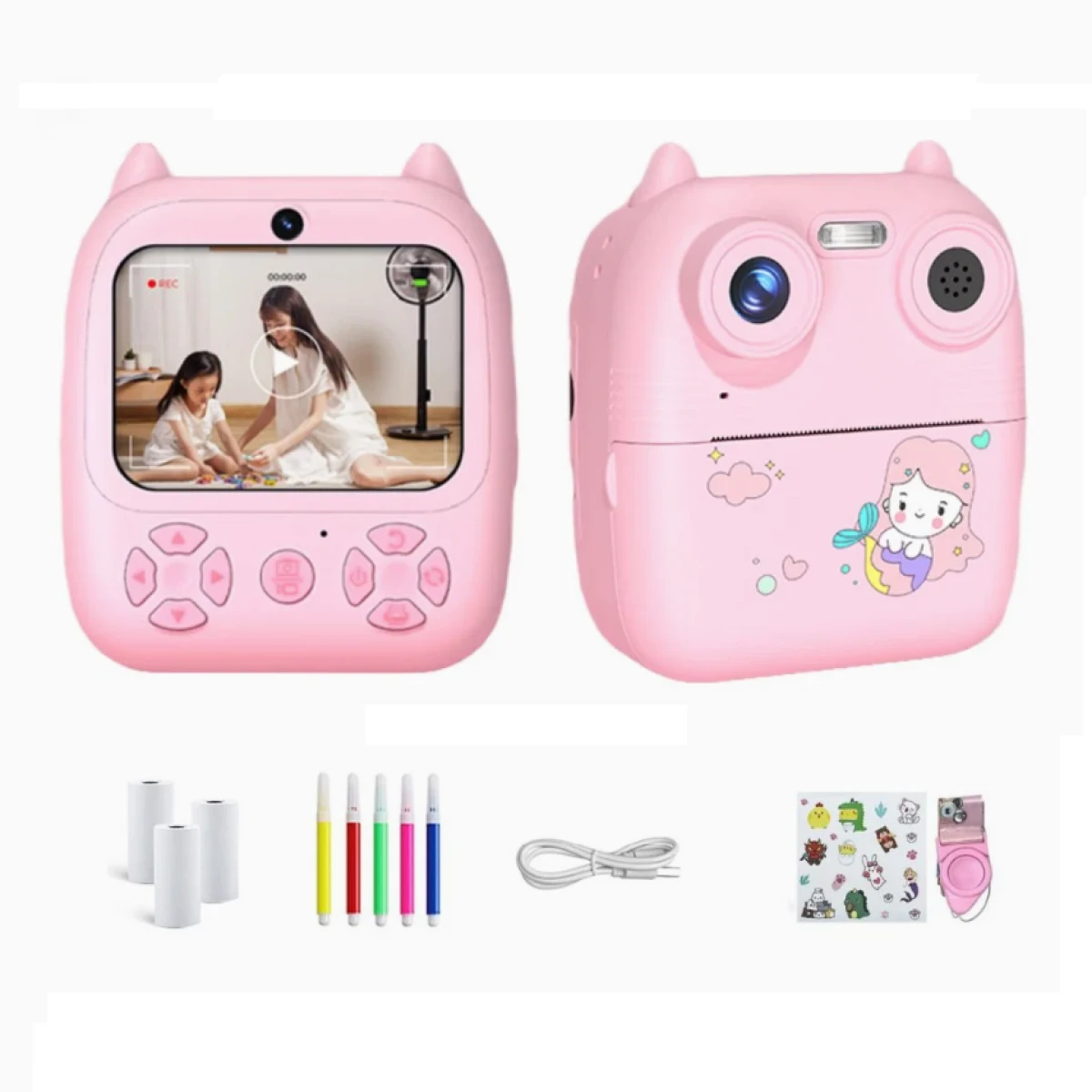 1 cámara de impresión para niños con 10 cm de alto x 9,5 cm de ancho X 4 cm de profundidad, 3 rollos de papel de impresión, kit con marcadores, 1 cable de carga, 1 correa para el cuello y 1 manual de usuario.